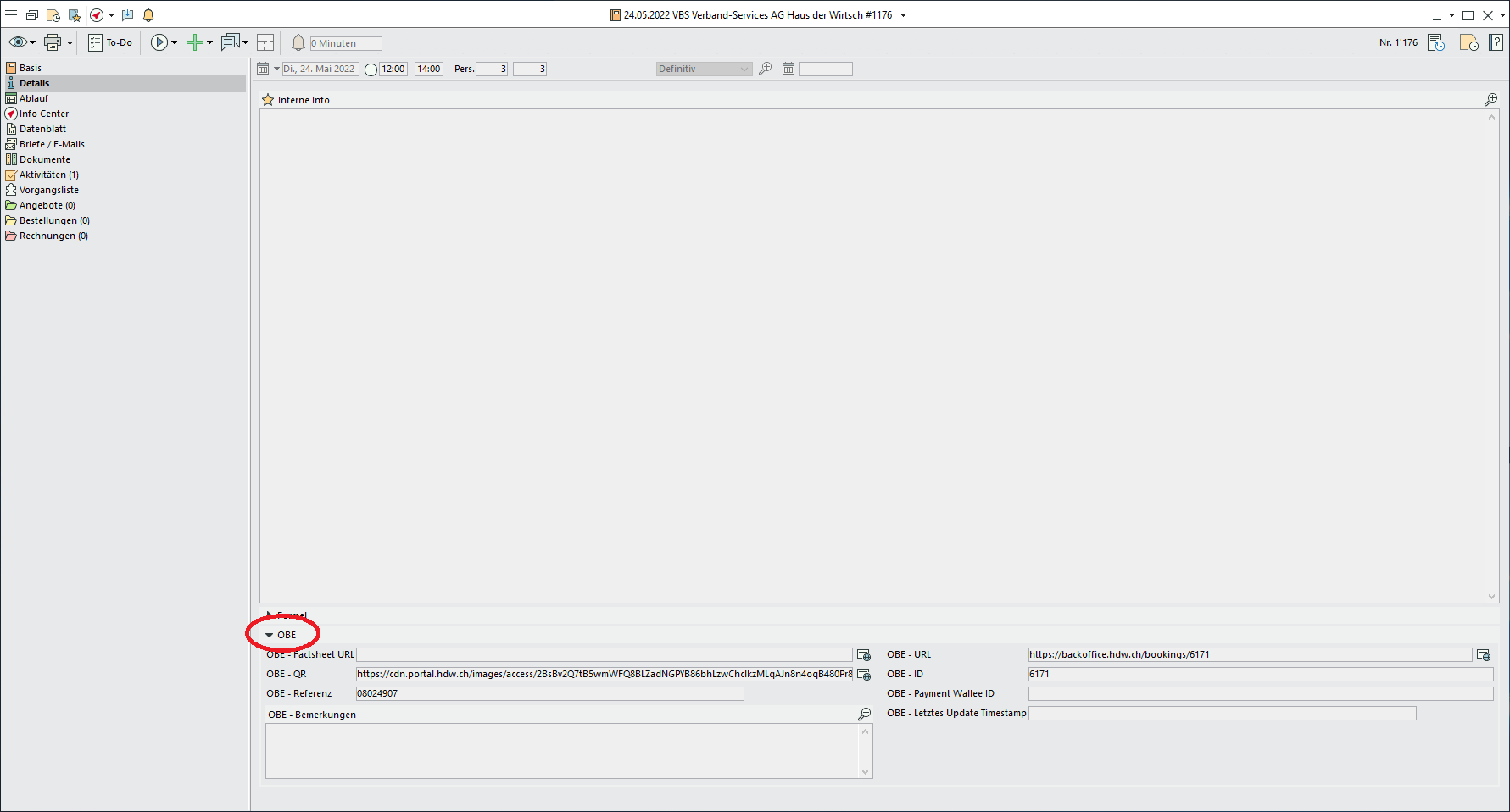 Export | RMS → BPE | Neue Buchungen, welche im via portal.hdw.ch getätigt werden, werden dem BPE gesendet. Es werden folgende Informationen dem BPE gesendet. – Allgemeine Informationen der Buchung (Titel, Start, Ende, Personen, Status, Buchungsnummer, Referenz, Kostenstelle, Factsheet Link, Backoffice Link zur Buchung und falls Kreditkartenzahlung dann Wallee-ID) |